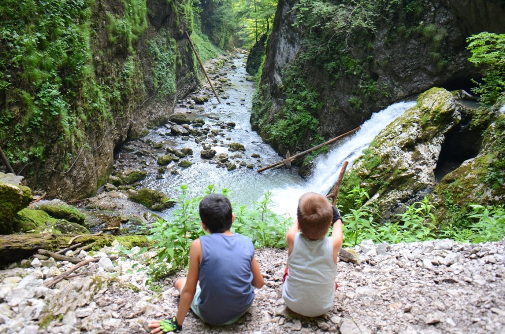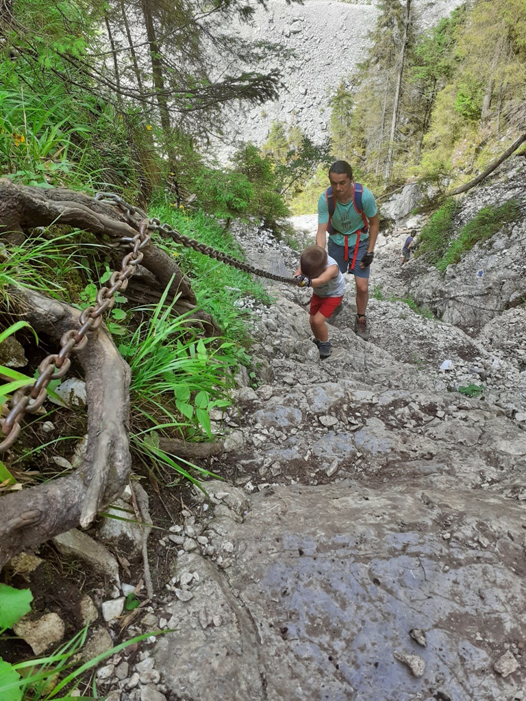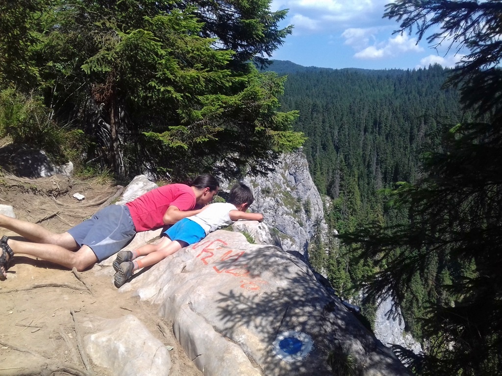 Urcarea de la gura peşterii până la pădure e de asemenea echipată cu cabluri, dar e foarte abruptă şi cei mici s-ar putea să ajungă mai greu la ele. Noi am parcurs traseul integral cu copiii pe picioare la 5 ani, dar e nevoie de un părinte care să fie permanent în spatele copilului, pentru siguranţă. Dacă nu vă simţiţi în stare, nu faceţi ca noi 🙂 Muntele rămâne tot acolo şi anul următor.