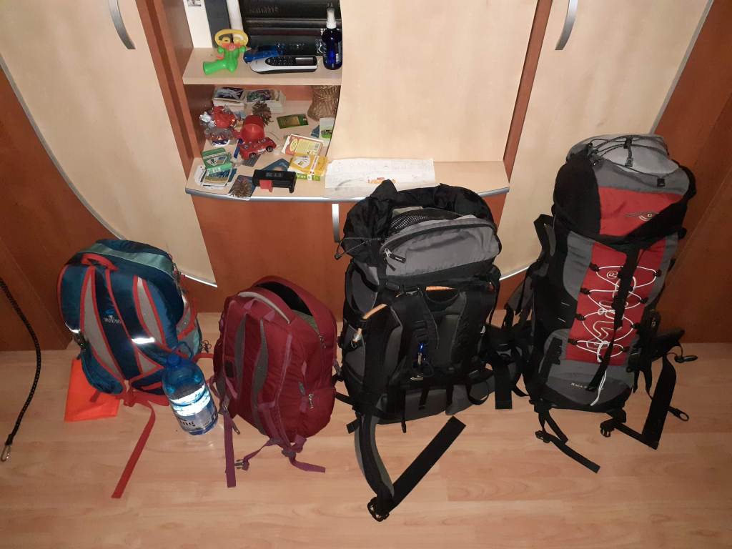 Aici fiecare face cum consideră, dar eu vă spun cum am procedat noi. Mihai nu a avut nimic în spate, am considerat că, dacă se duce pe el până sus, e suficient 🙂 Alex şi-a dus în rucsac sacul lui de dormit şi pelerinele. Mami a avut în spate doi saci de dormit, hainele ei şi ale copiilor şi izoprenele. Tati a avut sacul lui de dormit, hainele lui şi cele două corturi. Mâncarea şi apa le-am împărţit între noi, ca să echilibrăm cât de cât greutatea rucsacilor. Cam aşa arătau înainte de plecare (fără mâncare).