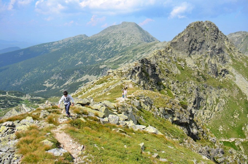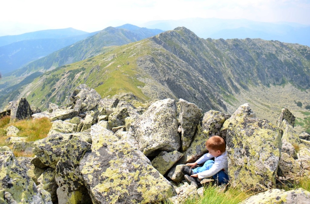 Al doilea traseu, cel ales de noi, urcă spre şaua Curmătura Bucurei, trece peste vârful Custura Bucurei şi merge pe creastă până pe Peleaga (vezi harta de mai sus). Acest traseu e mai lung şi cu diferenţă de nivel mai mare decât traseul direct, dar nouă ni s-a părut mai spectaculos şi, cum aveam toată ziua la dispoziţie, am profitat 🙂 Traseul urmăreşte mai multe marcaje, pentru că nu e unul direct. Până în şa se merge pe banda albastră, apoi spre vârf se ia banda roşie. Dar nu prea aveţi cum să vă rătăciţi nici fără marcaje, pentru că potecile sunt foarte bine bătute. Doar la intersecţii să fiţi atenţi, să luaţi marcajul potrivit 🙂 Traseul nu e uşor, dar piticii noştri erau super entuziasmaţi că aveau ocazia să se “joace” într-un “loc de joacă” pentru oamenii mari. Părţile de căţărat pe bolovani au fost cele mai apreciate.