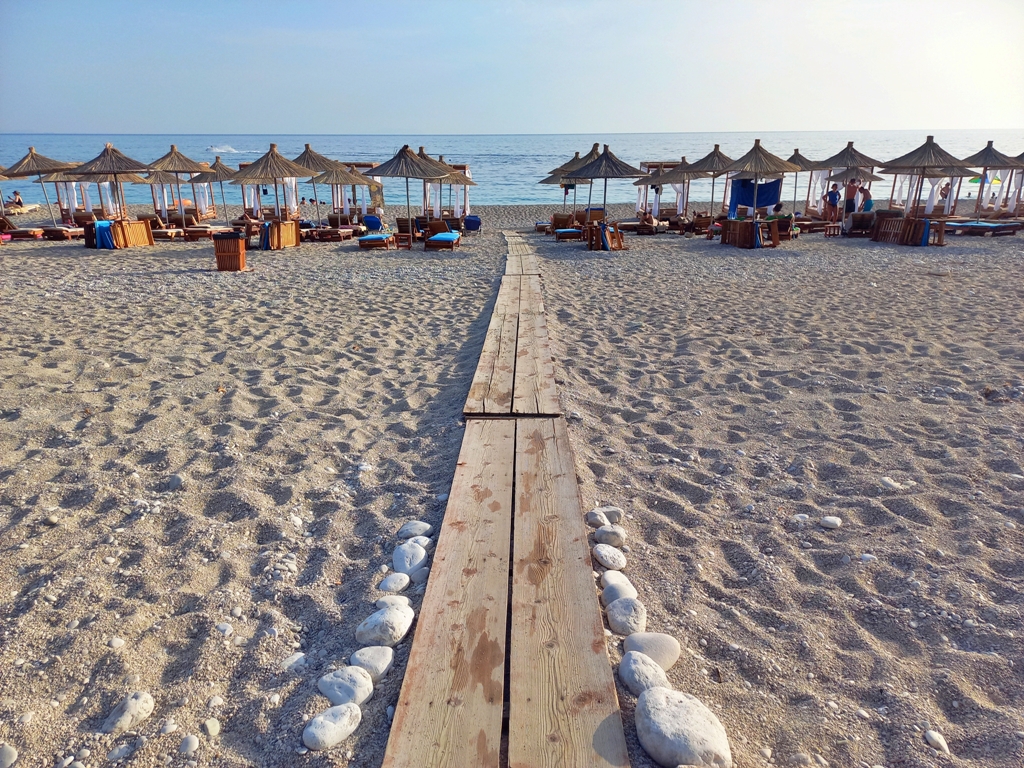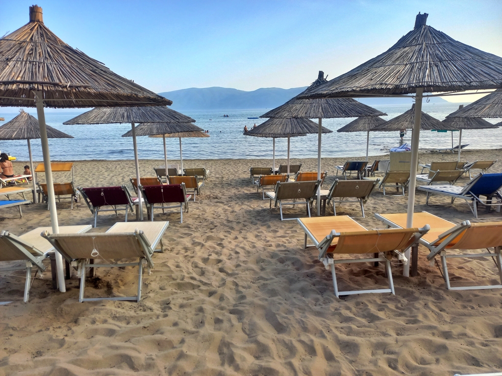 O altă mare stațiune, nu la fel de aglomerată ca Ksamil, cu o plajă destul de lungă, dar îngustă. Plaja e cu pietre, iar intrarea în apă e abruptă. La nici 3 metri de mal apa îmi era deja până la piept. Aici sunt locuri de prosoape, dar în mare parte e plin de șezlonguri. Dar nu am rămas mult aici, pentru că apa era rece. Noi am fost la plaja Potam, în sudul stațiunii, unde se varsă în mare două râuri și am presupus că din cauza asta e rece apa. Dar am înțeles de la alții că și apa de la plaja principală a stațiunii e la fel de rece.