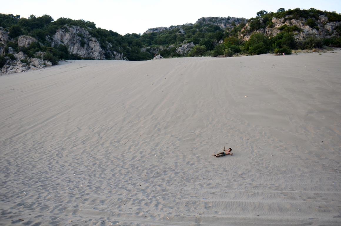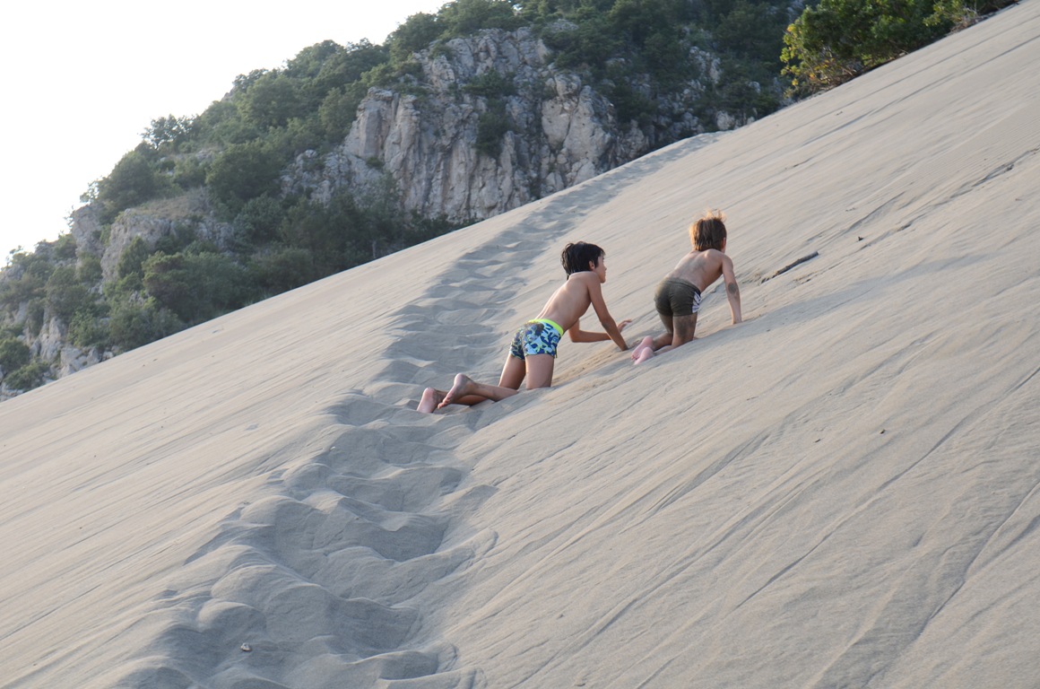 Pare ușor și scurt, dar să știți că nu e chiar așa ușor cum credeam să urci prin nisip fin. Dar e foarte amuzant, ne-am distrat bine toți. Ne-am trântit pe nisip, ne-am bătut cu nisip, am făcut cascade de nisip și am căutat gândăcei care fac urme drăguțe pe nisip. Apoi am luat-o la vale, direct spre mare, alergând. Știți senzația aia faină când alergi prin zăpadă pufoasă pe pantă mare? Exact la fel e și pe nisip, foarte tare! Și ajunși jos ne-am aruncat direct în valuri. Locul ăsta e ceva cu totul deosebit, sper să rămână la fel de sălbatic. 🙂