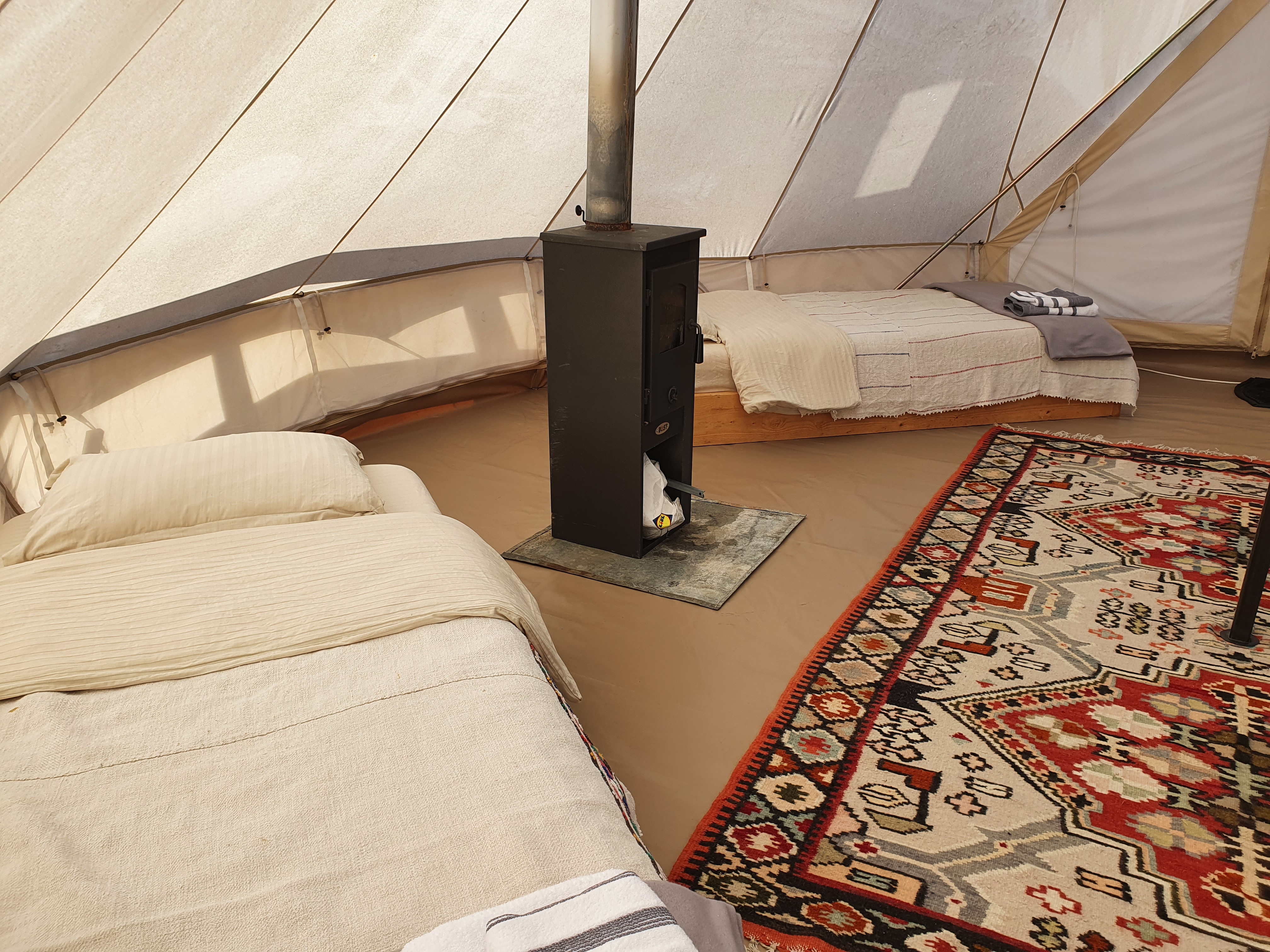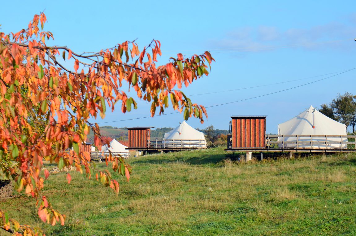În afară de căsuțe, complexul mai pune la dispoziție patru corturi de glamping. Pentru cei care nu știu, glamping înseamnă dormit la cort, dar un cort luxos, pe care nu îl cari tu în spate, ci îl găsești montat frumos la locul de cazare. Cele patru corturi tematice de aici au fiecare câte patru locuri de dormit (un pat matrimonial și două paturi de o persoană), o sobă cu lemne pentru când se face prea rece afară, o terasă cu măsuță și umbrelă, bucătărie și baie proprie. Cred că e singurul glamping din România care oferă așa ceva. Corturile sunt disponibile pentru cazare din mai până în noiembrie și sunt perfecte pentru familii cu copii. Colegii bloggeri de la FAM la pas turistic au fost aici în iulie 2022 și au povestit experiența lor în acest articol, pe care vă invit să-l citiți pentru mai multe detalii.
