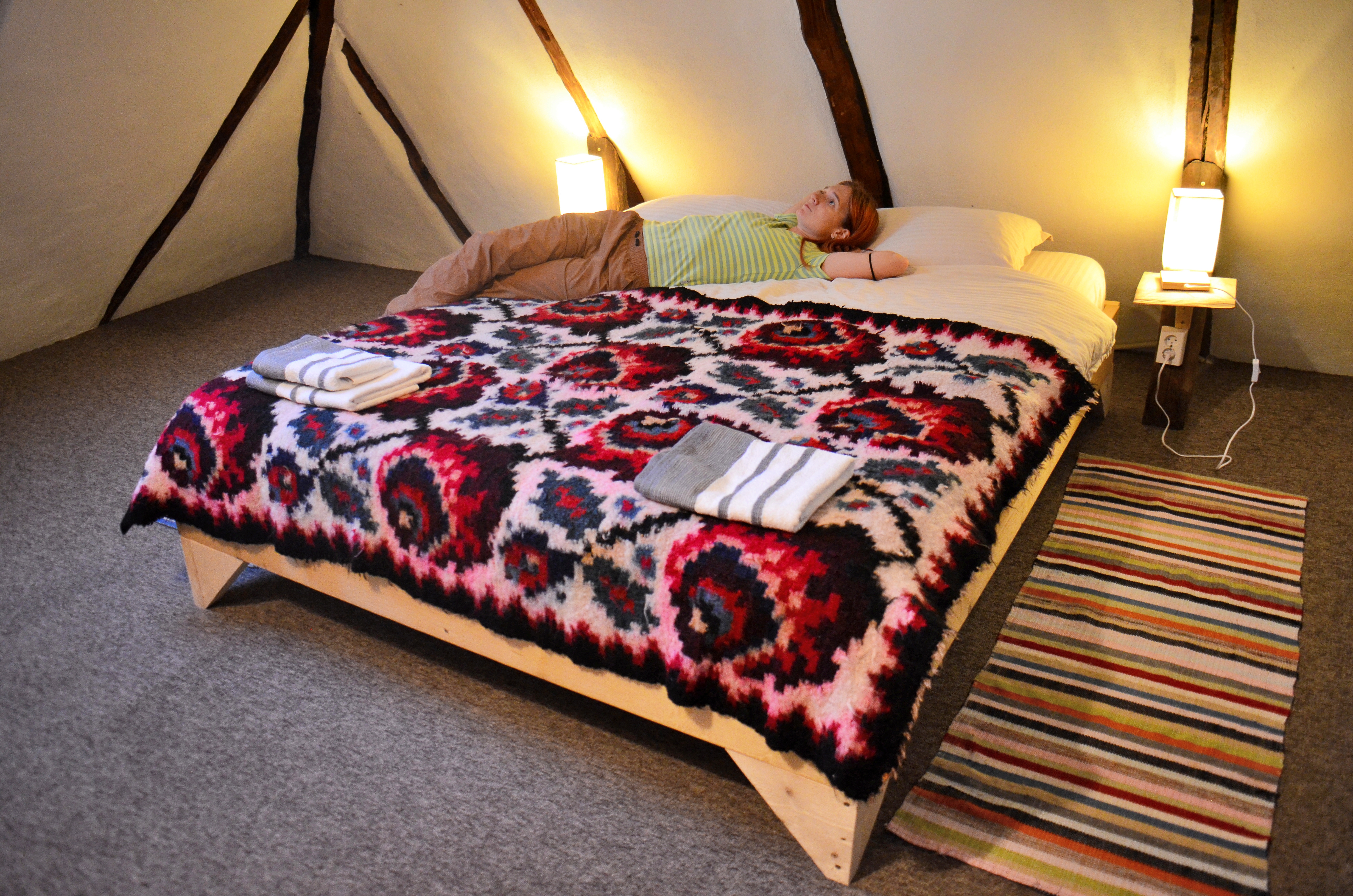 Pe lângă căsuța noastră, în complex mai sunt două case de lemn, Casa Bătrână, prima renovată, și Casa Strâmbă, cu un perete de sticlă prin care se poate admira cerul direct din pat. Sună a lună de miere, nu? 🙂