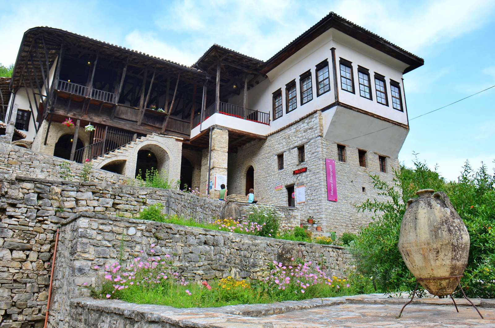 Supranumit „orașul celor 1000 de ferestre” datorită caselor de piatră îngrămădite în coasta dealului, din care se văd doar ferestrele, Berat se află la 85 km de Vlorë. Merge într-un day trip puțin tras de păr, noi ne-am întors pe somnul copiilor. Ai foarte multe de văzut aici, orașul vechi, cetatea cu bazarul, panorama de sus, centrul… Nouă ni s-a părut deosebit Muzeul Național de Etnografie, amenajat tot într-o culă otomană, ca la Casa Zekate. Cetatea e frumoasă, cu multe case vechi de piatră încă locuite și cu tăntici care mai de care mai convingătoare că gemul ei e cel mai bun 😂 Ne-am lăsat convinși de una și am cumpărat un gem de smochine delicios, deci nu mințea. Drept răsplată ne-a dus în curtea ei să ne arate un mozaic vechi, de pe peretele casei vecine. 😁