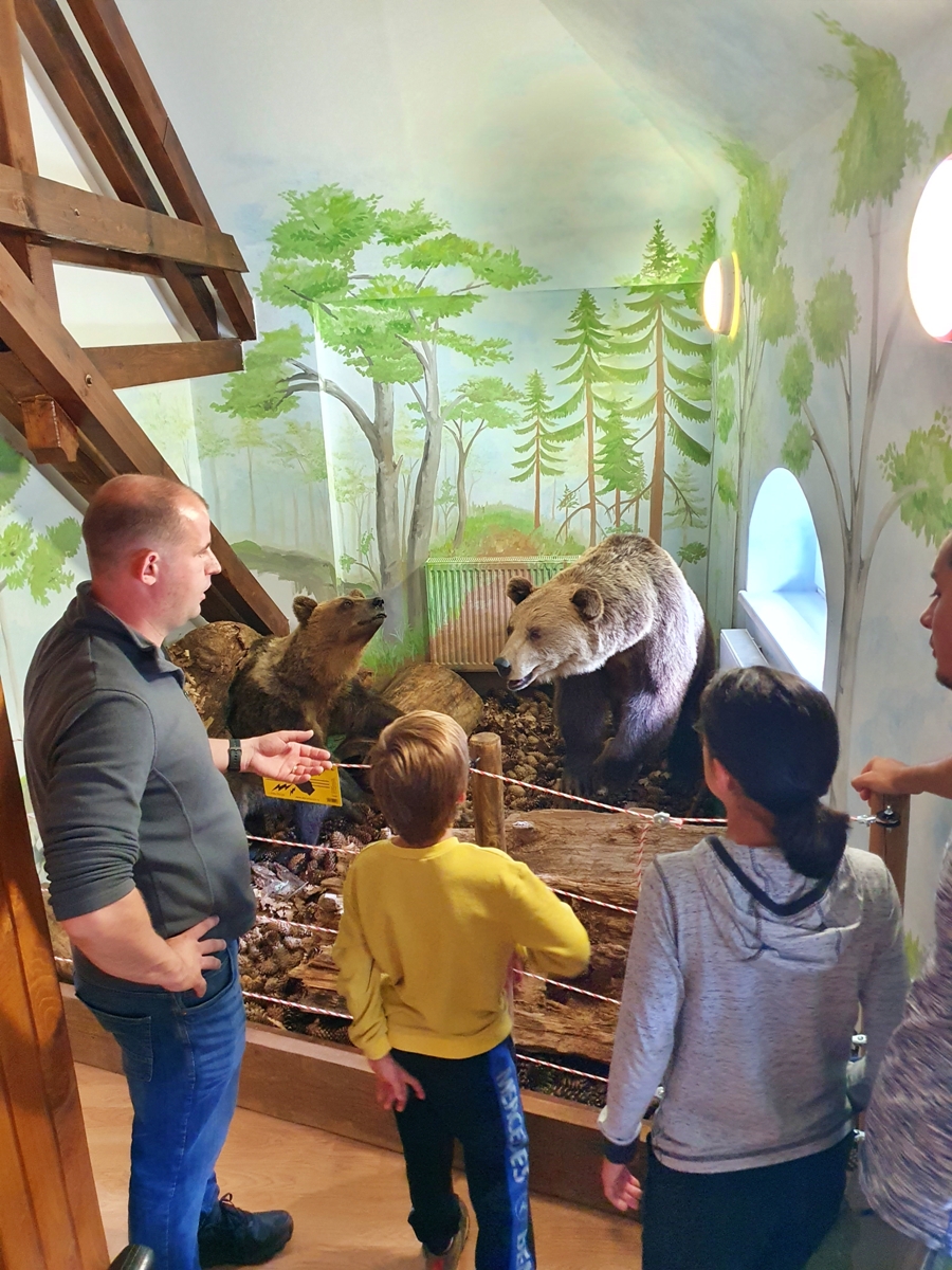 Începem explorările în destinația ecoturistică Băile Tușnad și Împrejurimile așa cum ar trebui să o facă oricine, și anume de la Tușnad Eco Bear Cave. Acest ”bârlog al urșilor” e un proiect conceput pentru a oferi vizitatorilor informații despre viața urșilor, despre istoria lor aici la Tușnad și conviețuirea localnicilor cu ei, de ce sunt importanți și de ce e și mai important să nu îi hrănim când îi întâlnim. Aici vizionăm întâi un film, iar apoi studiem cranii de urși, o blană de urs, amprentele labelor, un habitat recreat (cu urși în mărime naturală) și mai multe mostre de excremente, în care se poate vedea ce au mâncat urșii. Vedem clar dieta, formată din iarbă, fructe de pădure, plante și… pungi de plastic Da, au fost găsite inclusiv pungi în excrementele urșilor, ceea ce ar trebui să ne dea serios de gândit.
