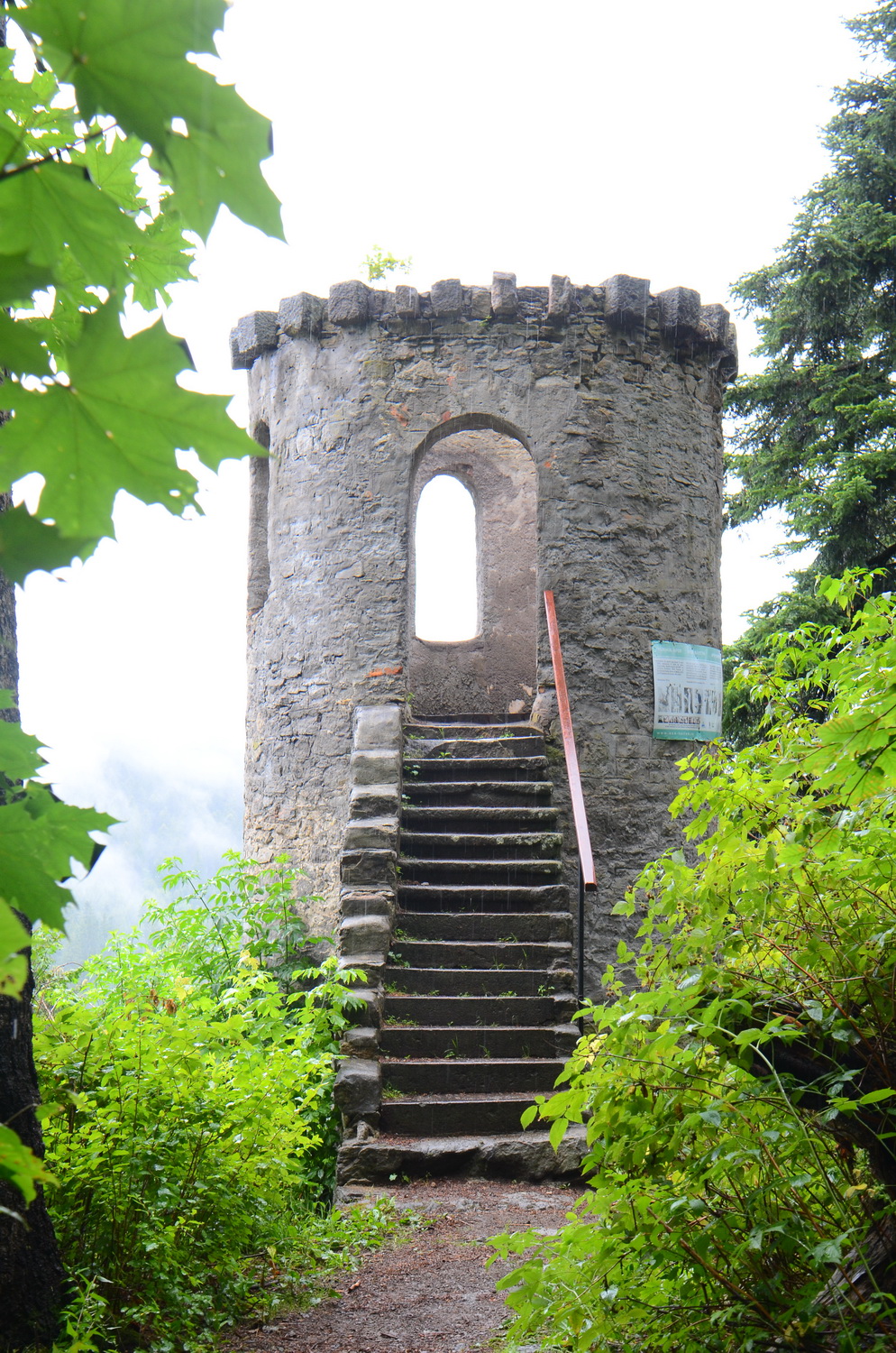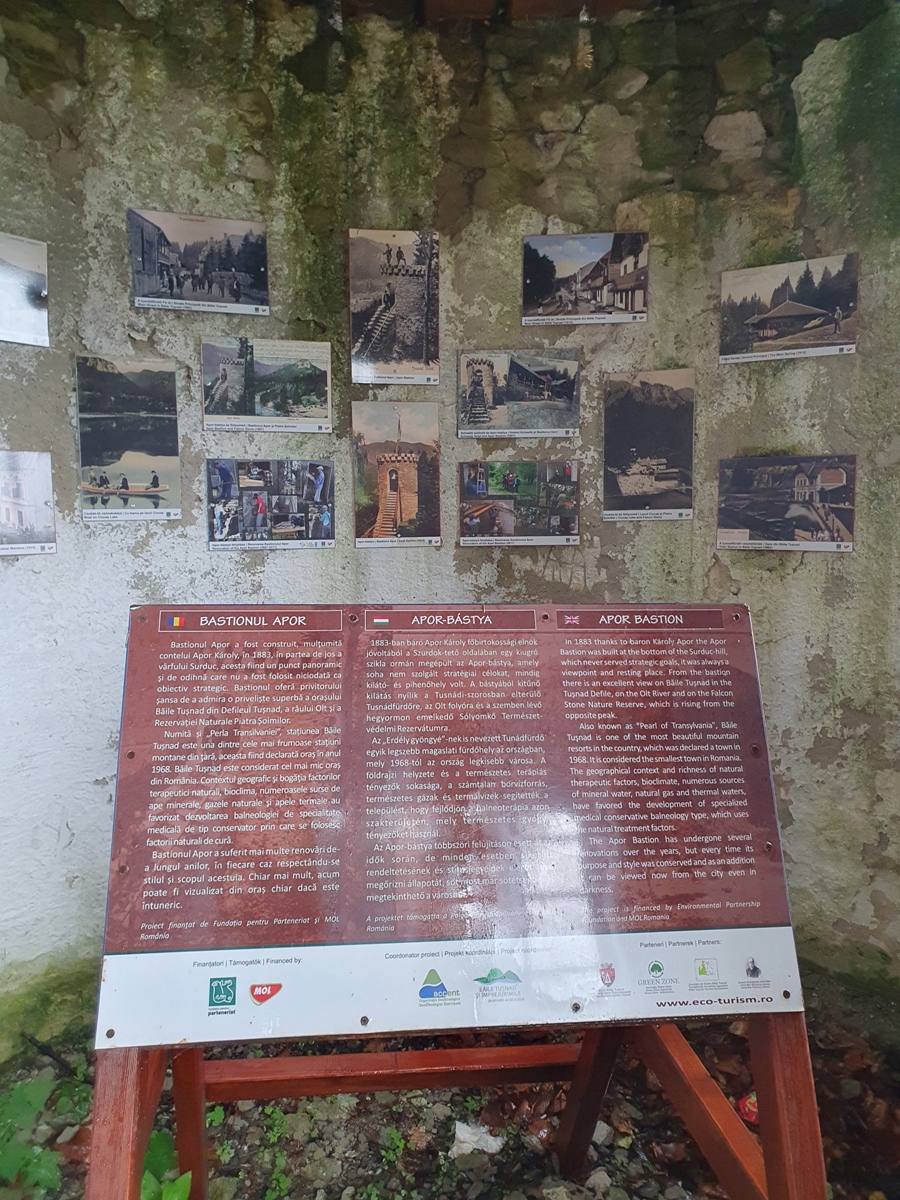 Fiind lângă izvoarele minerale, continuăm pe alee, care se transformă în drum pietruit, apoi în potecă, spre turnul Apor. Cred că a fost primul lucru pe care l-am văzut când am intrat în oraș, un turnuleț singur, cocoțat pe deal, de unde veghează asupra stațiunii. Aflat la altitudinea de 700 m, turnul Apor a fost construit în 1883, cu rol de punct panoramic, fiind unul dintre cele două locuri din care poate fi admirat Tușnadul de la înălțime.