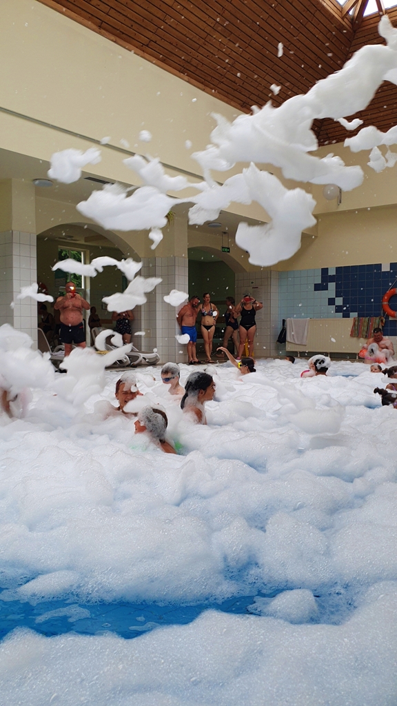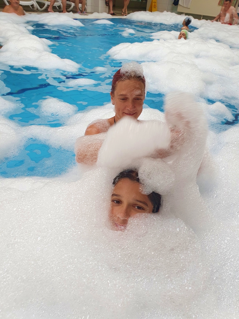 Nu am reușit să intrăm la saună, era prea cald după ce am venit din ploaia de afară. Dar ne-am bucurat din plin de toate bazinele și am avut parte și de o surpriză: spuma party în bazinul mare 😁 Și știți care e cea mai faină chestie? Că vă puteți bucura de toate astea cu doar 19 lei (față de 50, cât e biletul pe site) dacă vă cazați la pensiunile Stânca Șoimilor, Flora sau Viktoria! Cool, nu?