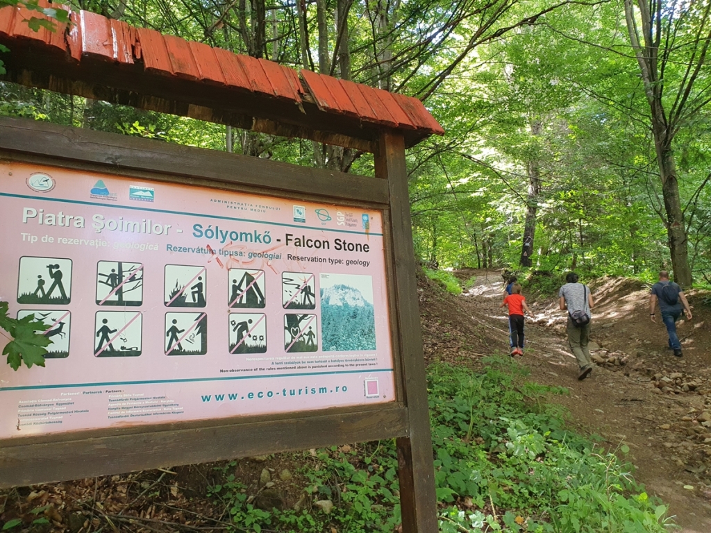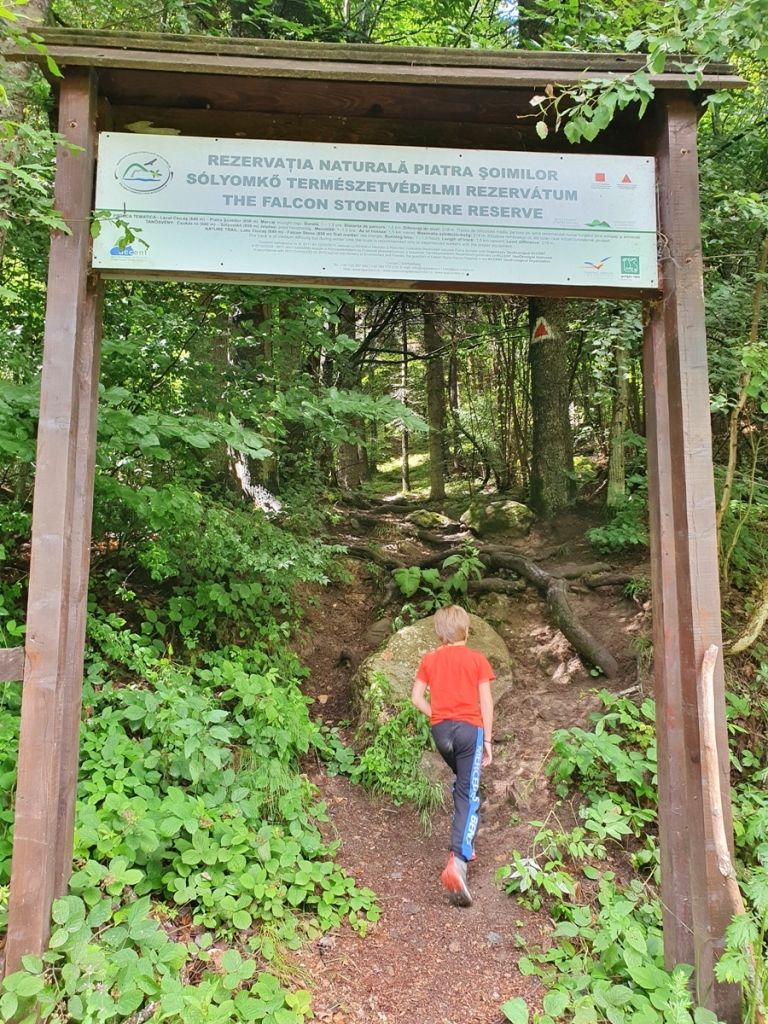 Al doilea loc e Stânca Șoimilor. Nu pensiunea, ci stânca propriu-zisă 🙂 de la care și-a luat numele și pensiunea. Poteca spre punctul de belvedere pornește de lângă terenul de fotbal, de aici, unde se poate lăsa mașina. Traseul e marcat cu triunghi roșu și durează aproximativ o oră. E urcuș continuu până pe piatră, dar nu e greu deloc. E amenajată și o potecă tematică, cu panouri informative despre fauna, flora, geologia și caracteristicile zonei. Odată ajunși sus, ni se deschide în față, în toată splendoarea, întreaga stațiune Băile Tușnad. Care, după cum vă spuneam, nu e mare deloc. Dar priveliștea de sus e foarte frumoasă, ne pare bine că am urcat. De sus încercăm să localizăm și punctele cheie: lacul Ciucaș, izvoarele minerale, turnul Apor, mofetele și pensiunea noastră.