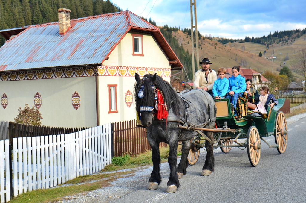 Cu burticile pline, am pornit să admirăm frumoasele case pictate din Ciocănești. Dar nu oricum, ci într-o plimbare ușoară cu o căruță autentică bucovineană, mulțumită lui Aurel de la Casa Aureliană. Aurel e singurul care organizează astfel de plimbări și vă recomand să profitați de această modalitate originală de a descoperi satul și minunatele case pictate pe exterior.