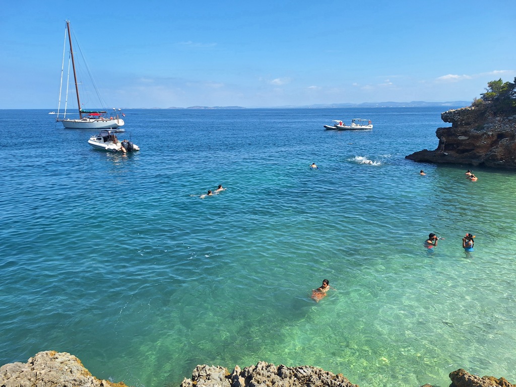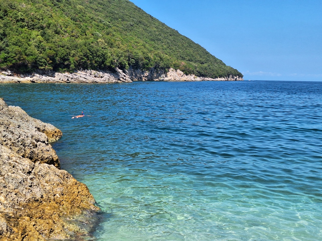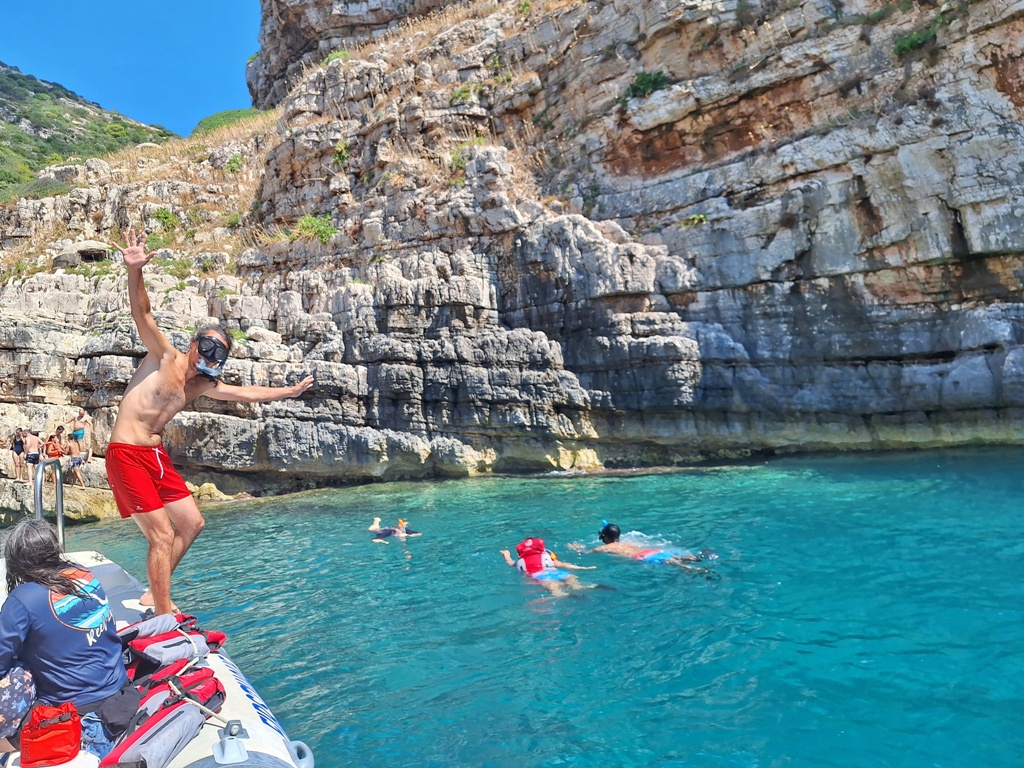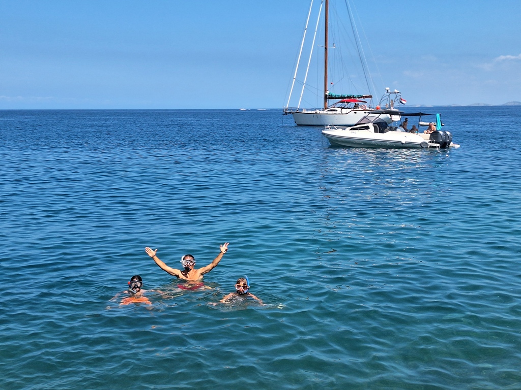 On the day we chose, the Trips4Fun boat was waiting for us in the port of Vlorë, where we boarded. First stop was St. George Bay, where the boys immediately jumped into snorkeling. Only after did they remember the guide had also mentioned a cave, and we swam there, curious to explore. We spent about 45 minutes in that little bay — it was just enough.