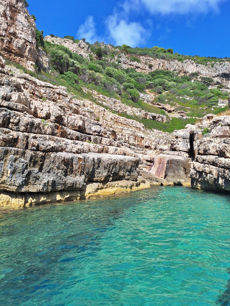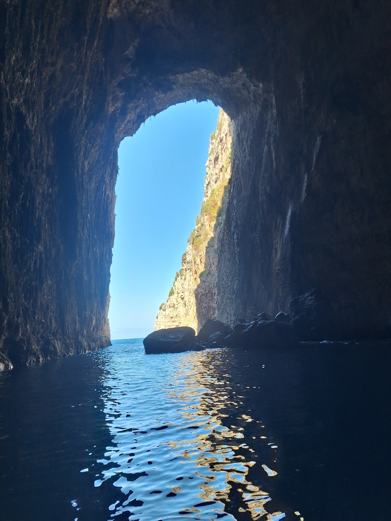 Next stop: Haxhi Ali Cave, a natural cathedral carved by the sea. Back in the 17th century, the Ottoman pirate Haxhi Ali used this as his observation base. Legend has it he hid treasure in the cave and used its wide entrance — over 30 meters high — to escape pursuing ships.