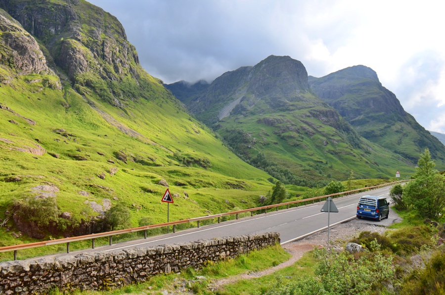 Drumul spre Glen Etive este spectaculos, îngust, dar accesibil familiilor.