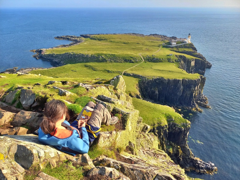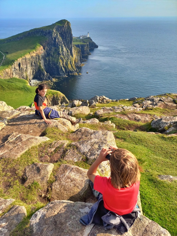 După-amiaza am luat-o spre Neist Point, cel mai vestic punct al insulei. Nu am mers până la far, dar am urcat pe vârfurile din zonă, de unde se vede spectaculos. Am și urmărit cu binoclul păsările marine cum își aduc mâncarea puilor. Un adevărat documentar pe viu!
