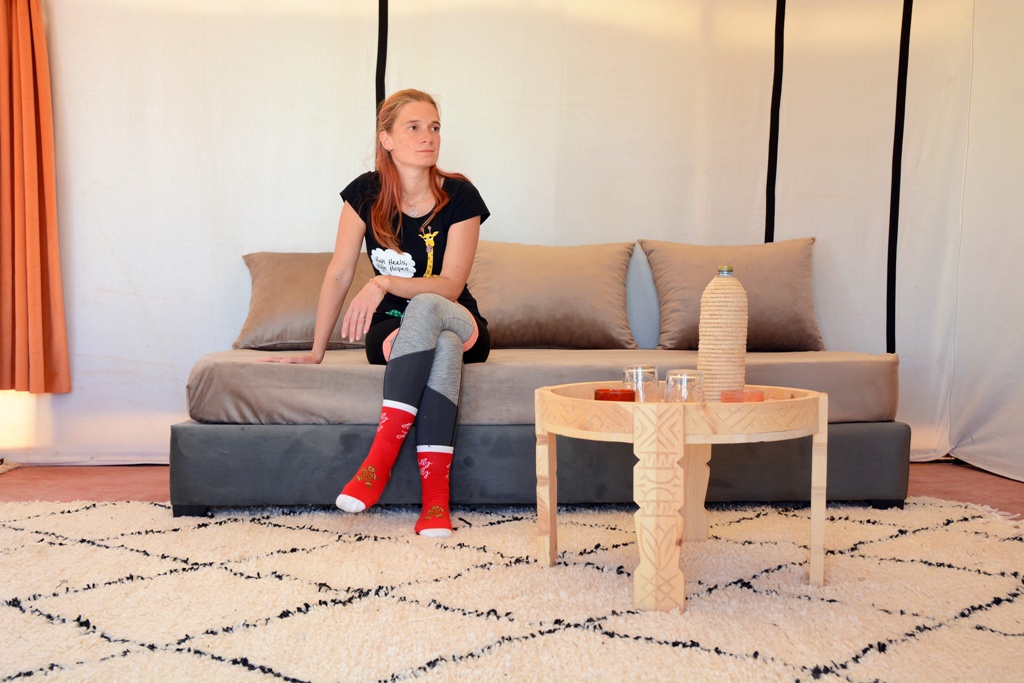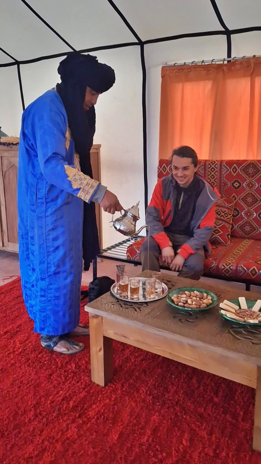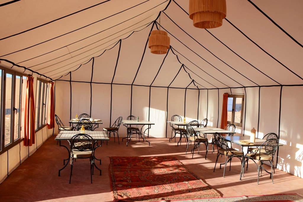 Am intrat în cortul-restaurant, unde am stat puțin de vorbă cu Salem. Ne-a povestit despre copilăria lui în deșert, despre viața într-o familie nomadă amazigh și despre cum visul lui a fost să creeze o tabără de corturi în deșert unde turiștii să simtă autentic viața din sudul Marocului.