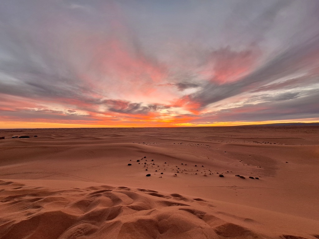 Voiam o cazare tradițională, unde să simțim spiritul amazigh, să fim înconjurați de deșert și nu de ATV-uri și să ne trezească soarele dimineața, nu zgomotul de jeepuri. Căutând prin zona Merzouga, am văzut că acolo taberele sunt foarte apropiate și îngrămădite. Atunci mi-am îndreptat atenția spre celălalt deșert celebru din sudul Marocului: Erg Lihoudi, la sud de Zagora, aproape de granița cu Algeria. Am văzut că acolo sunt doar câteva corturi, ici-colo, ascunse printre dune. Și ce înseamnă asta? Exact ce căutam eu: liniște, autentic și un deșert al nostru! 😀